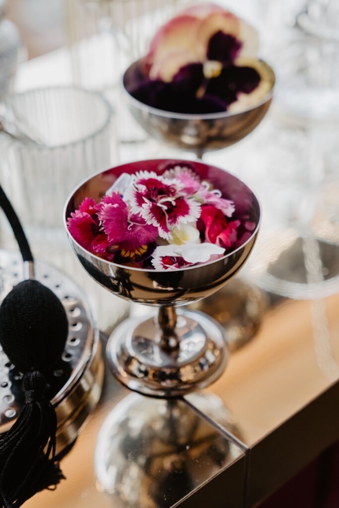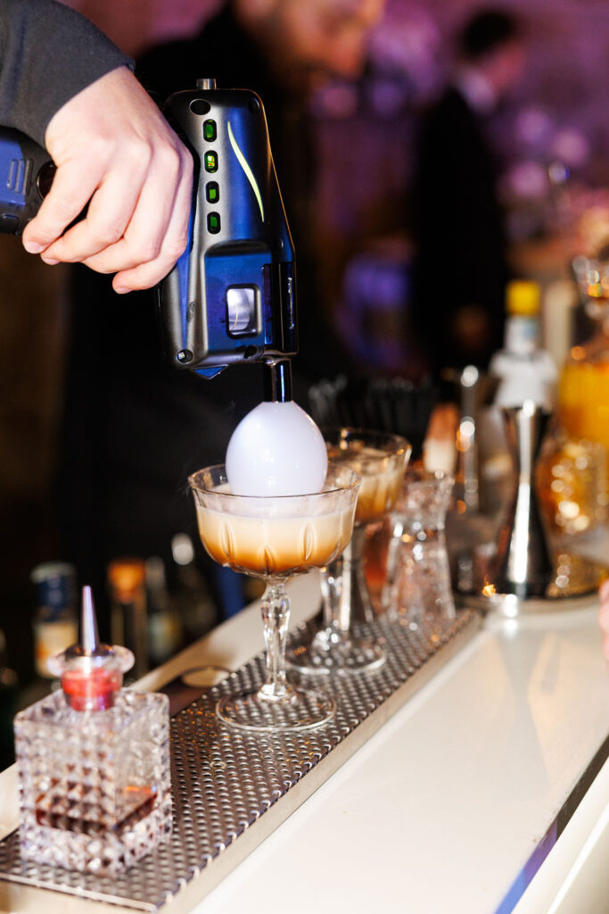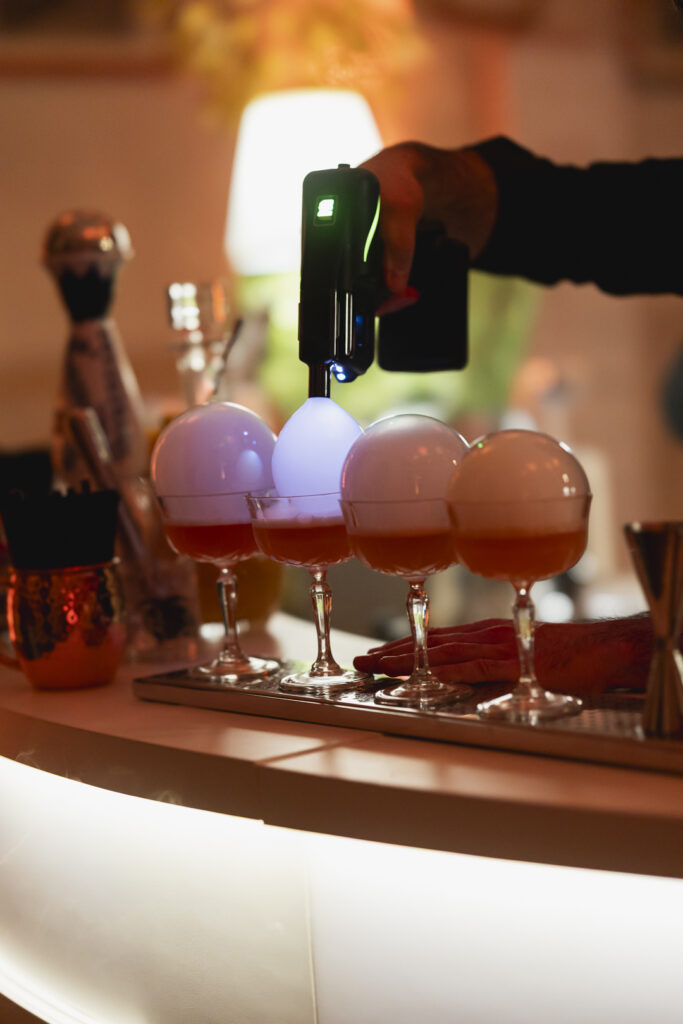 Attention to detail plays a key role in our approach, especially when it comes to what we define as little luxuries: bespoke refined elements designed to enhance both the visual and sensory experience of each cocktail. These include edible cocktail toppers, customized ice stamping, fresh or dried edible flowers, interactive aromatic bubbles created with the Flavour Blaster, and edible prints on cocktail foam using food-grade printing technology.